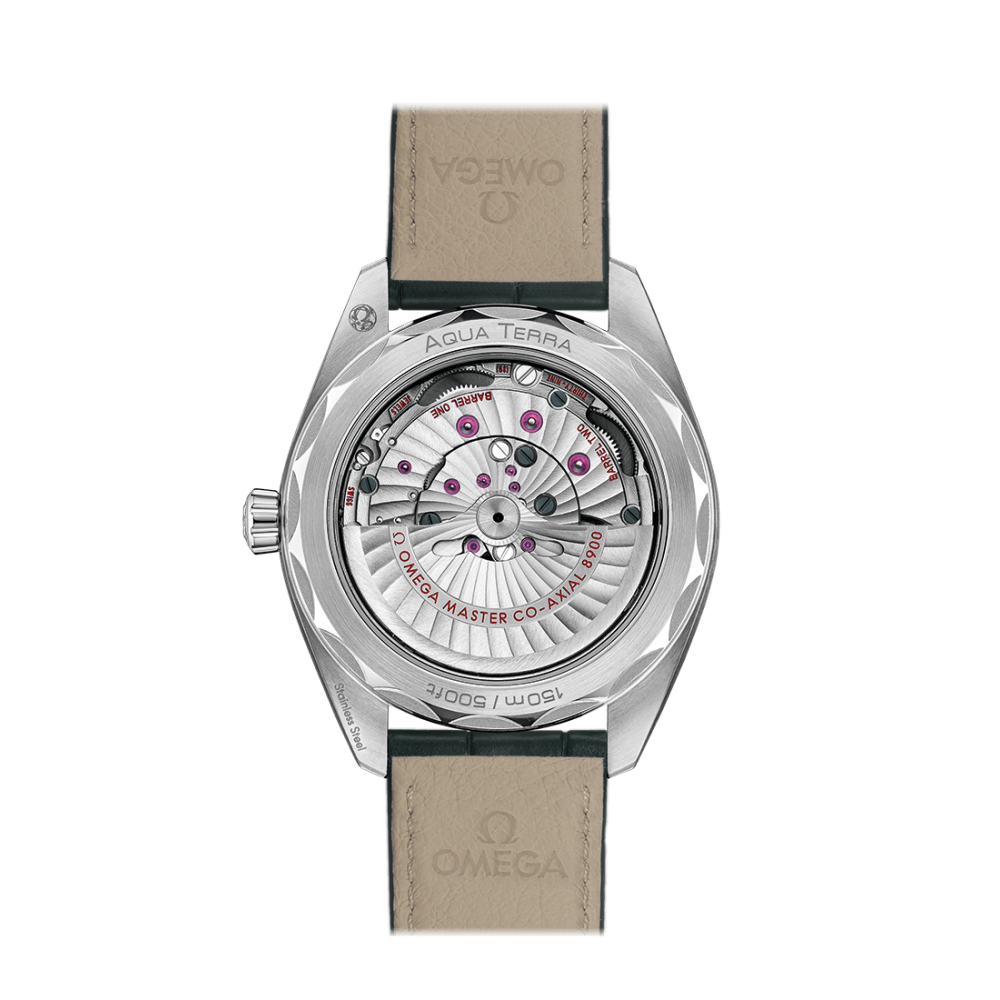 Omega Seamaster Aqua Terra 150M Master Chronometer 220.13.41.21.10.001 - men's watch produced by Omega. It has Swiss automatic movement and 8900 calibre. Stainless steel case of round shape. Case dimensions are 41 mm. in diameter and 13.2 mm. in thickness. The dial of this Omega watch is green. Display type: analog. This timepiece has sapphire, antireflection coating glass. Calf leather band, band color: green. 150 m. water resistance. The watch is from Seamaster collection. The following features are equipped: chronometer, date, antimagnetic, screw-down crown, glowing hands, glowing markers.