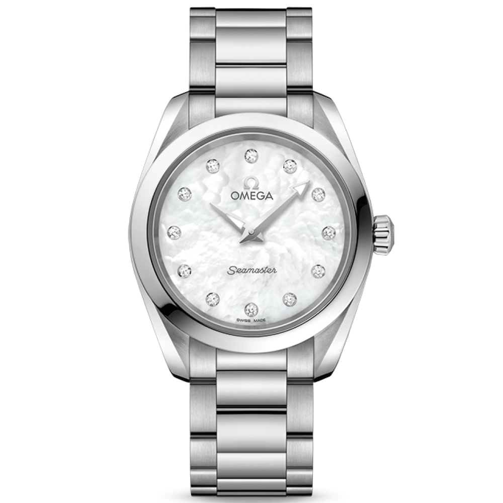 Omega Seamaster Aqua Terra 150M Quartz Lady 220.10.28.60.55.001 - ladies watch manufactured by Omega. It has Swiss quartz movement and 4061 calibre. Stainless steel case of round shape. Case dimensions are 28 mm. in diameter and 9.5 mm. in thickness. The dial of this Omega watch is mother of pearl. Display type: analog. This timepiece has sapphire, antireflection coating glass. Stainless steel band, band color: silver. 150 m. water resistance. The watch is from Seamaster collection. The following features are equipped: glowing hands, diamond set.
