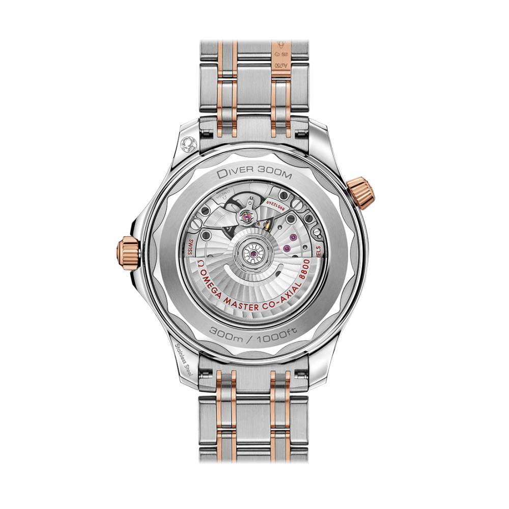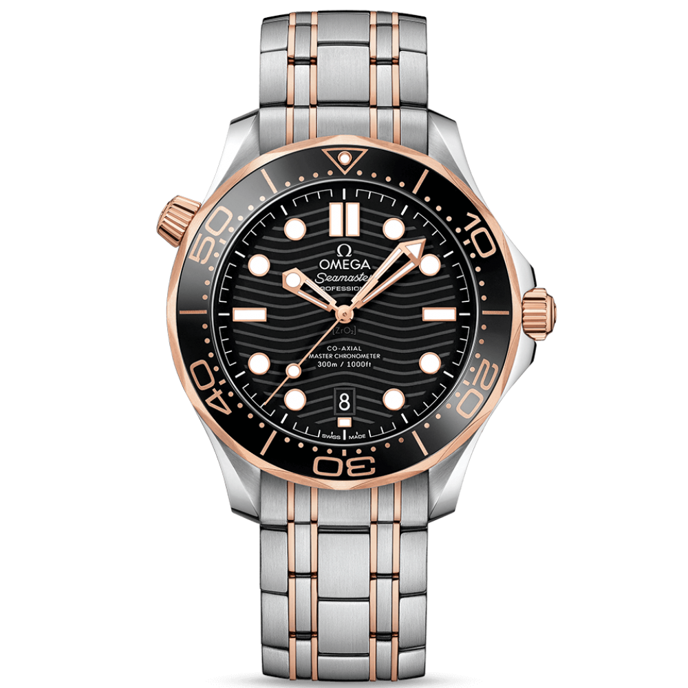 Omega Seamaster Diver 300M Master Chronometer 210.20.42.20.01.001 - men's watch produced by Omega. It is equipped with Swiss automatic movement and 8800 calibre. Stainless steel, gold, ceramic case of round shape. Case dimensions are 42 mm. in diameter and 13.6 mm. in thickness. The dial of this Omega watch is black. Display type: analog. This timepiece has sapphire, antireflection coating glass. Stainless steel, gold band, band color: silver, gold. 300 m. water resistance. The watch is from Seamaster collection. The following features are equipped: antimagnetic, chronometer, screw-down crown, glowing markers, glowing hands, date.