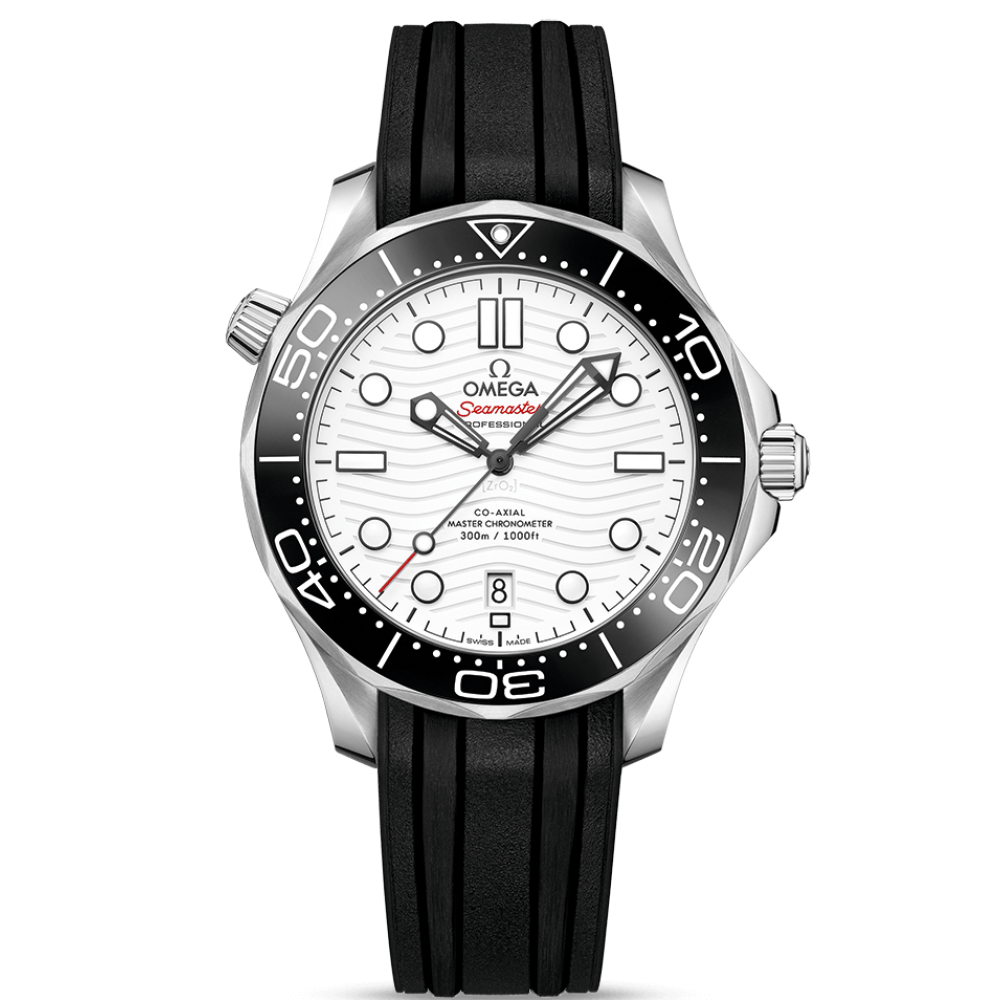 Omega Seamaster Diver 300M Master Chronometer 210.32.42.20.04.001 - men's watch made by Omega. It is equipped with Swiss automatic movement and 8800 calibre. Stainless steel, ceramic case of round shape. Case dimensions are 42 mm. in diameter and 13.6 mm. in thickness. The dial of this Omega watch is white. Display type: analog. This timepiece has sapphire, antireflection coating glass. Rubber band, band color: black. 300 m. water resistance. The watch is from Seamaster collection. The following features are equipped: antimagnetic, chronometer, screw-down crown, glowing markers, glowing hands, date.