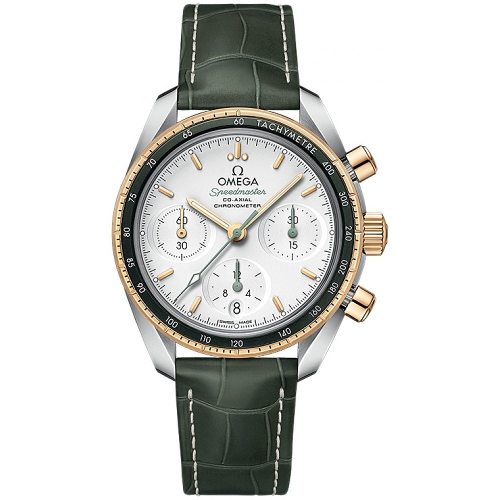 Omega Speedmaster 38 324.23.38.50.02.001 - unisex watch made by Omega. It is equipped with Swiss automatic movement and 3330 calibre. Stainless steel, 18k sedna™ gold, aluminum case of round shape. Case dimensions are 38 mm. in diameter and 14.7 mm. in thickness. The dial of this Omega watch is silver. Display type: analog. This timepiece has sapphire, antireflection coating glass. Alligator band, band color: green. 100 m. water resistance. The watch is from Speedmaster collection. The following features are equipped: chronograph, chronometer, date, glowing hands, glowing markers.