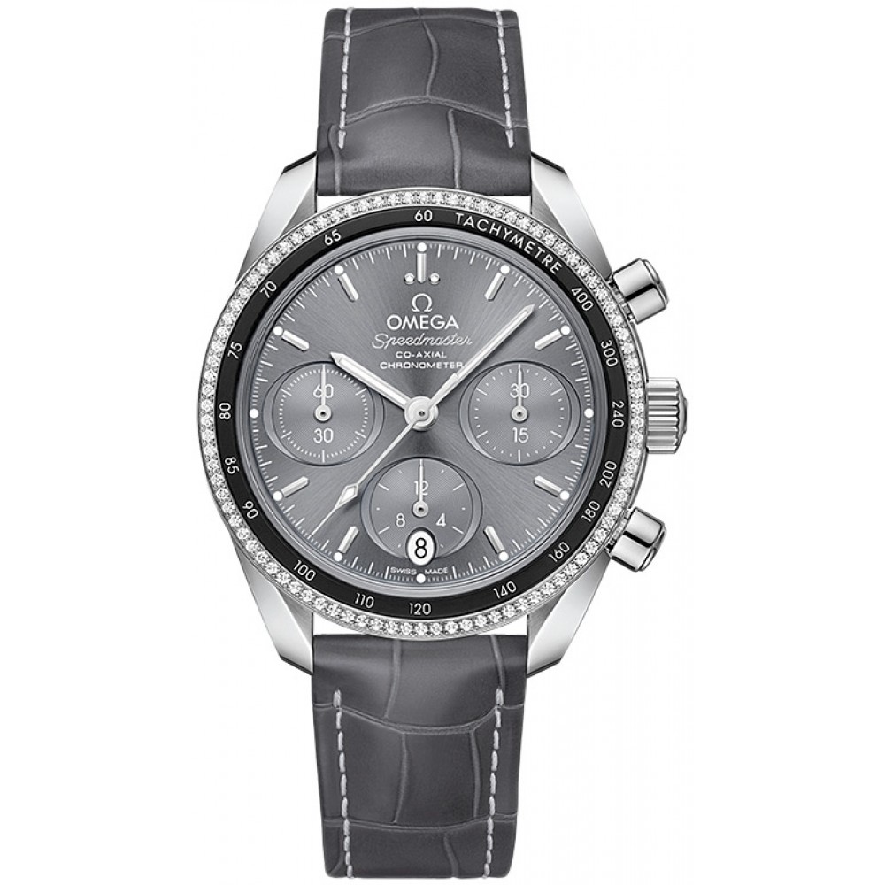 Omega Speedmaster 38 324.38.38.50.06.001 - ladies watch made by Omega. It is equipped with Swiss automatic movement and 3330 calibre. Stainless steel, aluminum case of round shape. Case dimensions are 38 mm. in diameter and 14.7 mm. in thickness. The dial of this Omega watch is gray. Display type: analog. This timepiece has sapphire, antireflection coating glass. Alligator band, band color: gray. 100 m. water resistance. The watch is from Speedmaster collection. The following features are equipped: chronograph, chronometer, date, glowing hands, glowing markers, diamond set.