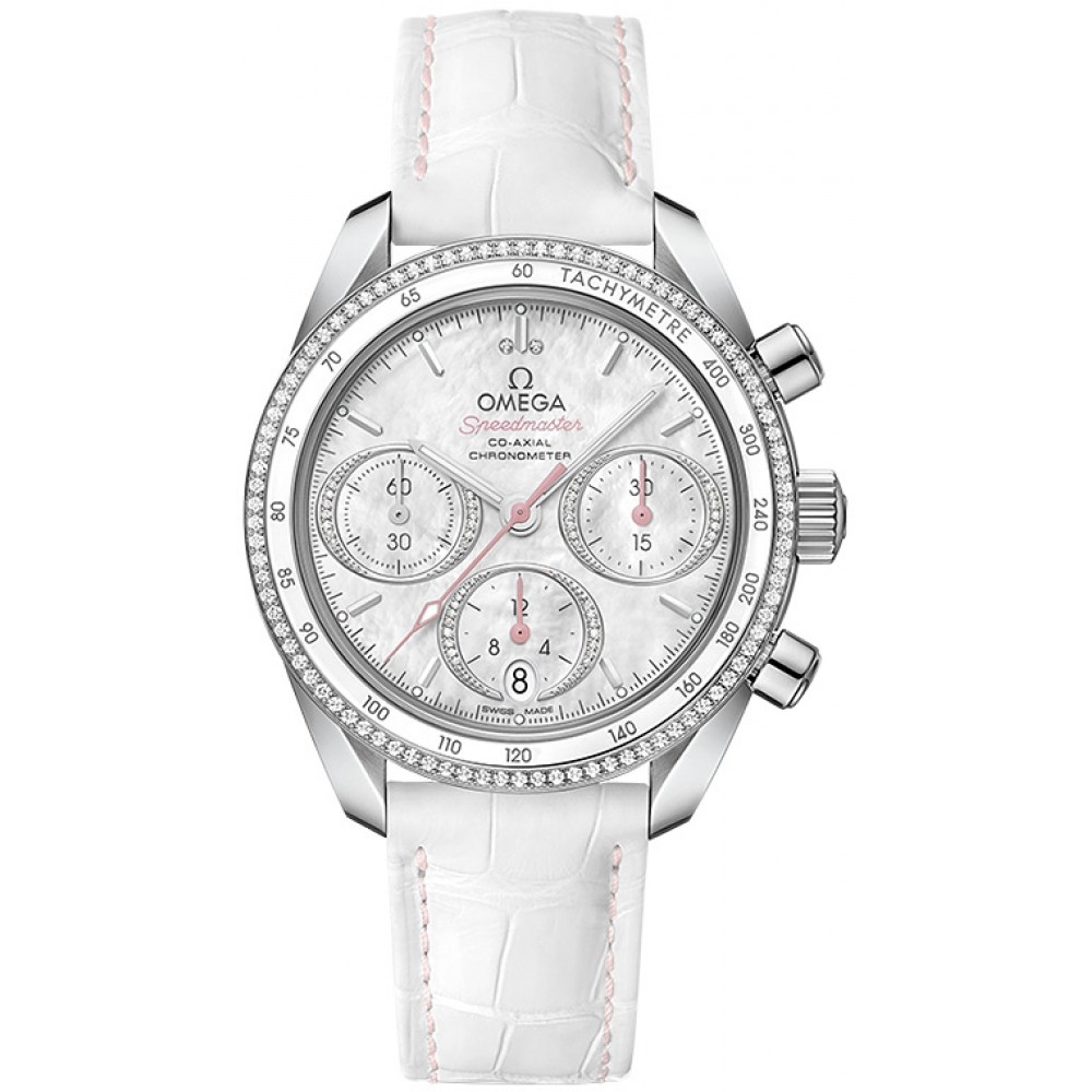Omega Speedmaster 38 324.38.38.50.55.001 - ladies watch produced by Omega. It has Swiss automatic movement and 3330 calibre. Stainless steel, ceramic case of round shape. Case dimensions are 38 mm. in diameter and 14.7 mm. in thickness. The dial of this Omega watch is mother of pearl. Display type: analog. This timepiece has sapphire, antireflection coating glass. Alligator, calf leather band, band color: white. 100 m. water resistance. The watch is from Speedmaster collection. The following features are equipped: chronograph, chronometer, date, glowing hands, glowing markers, diamond set.
