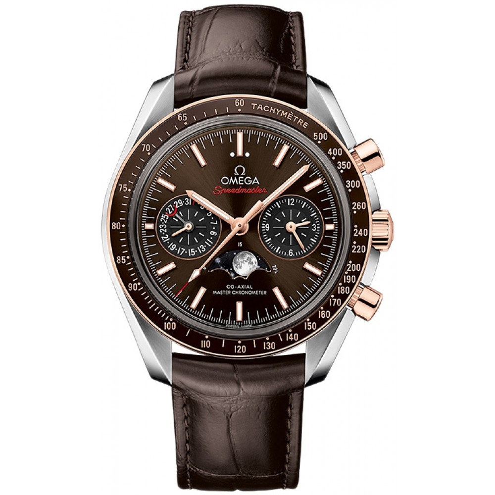 Omega Speedmaster Moon Phase Master Chronometer 304.23.44.52.13.001 - men's watch produced by Omega. It has Swiss automatic movement and 9904 calibre. Stainless steel, 18k sedna™ gold case of round shape. Case dimensions are 44.25 mm. in diameter and 16.9 mm. in thickness. The dial of this Omega watch is brown. Display type: analog. This timepiece has sapphire, antireflection coating glass. Alligator band, band color: brown. 100 m. water resistance. The watch is from Speedmaster collection. The following features are equipped: chronograph, antimagnetic, chronometer, glowing hands, glowing markers, date, moon phase.