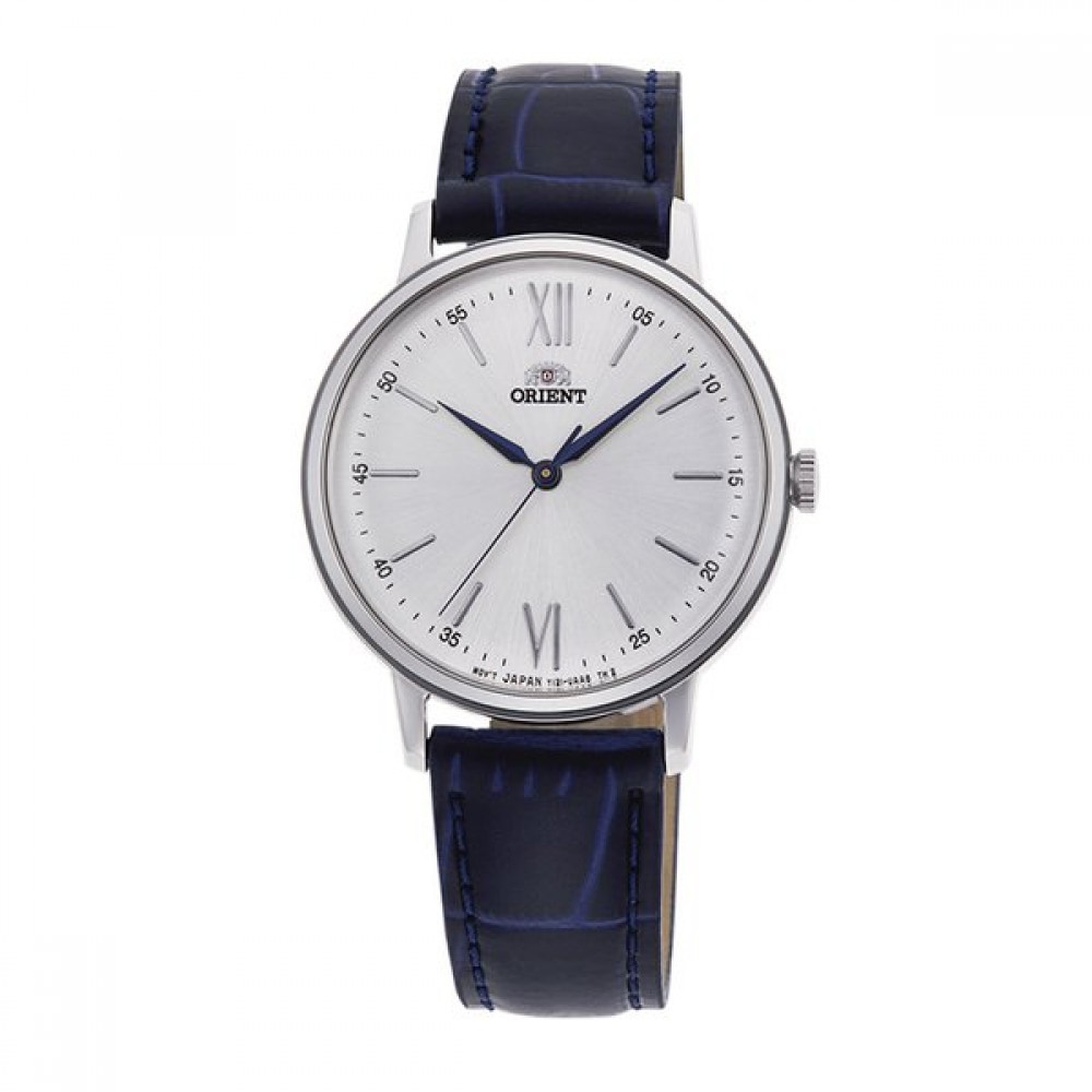 Orient Classic RN-QC1705S - ladies watch made by Orient. It is equipped with Japanese quartz movement and Y1212 calibre. Stainless steel case of round shape. Case dimensions are 33.5 mm. in diameter and 8.5 mm. in thickness. The dial of this Orient watch is silver, white. Display type: analog. This timepiece has mineral glass. Leather band, band color: blue. 50 m. water resistance. The watch is from Orient Classic collection.