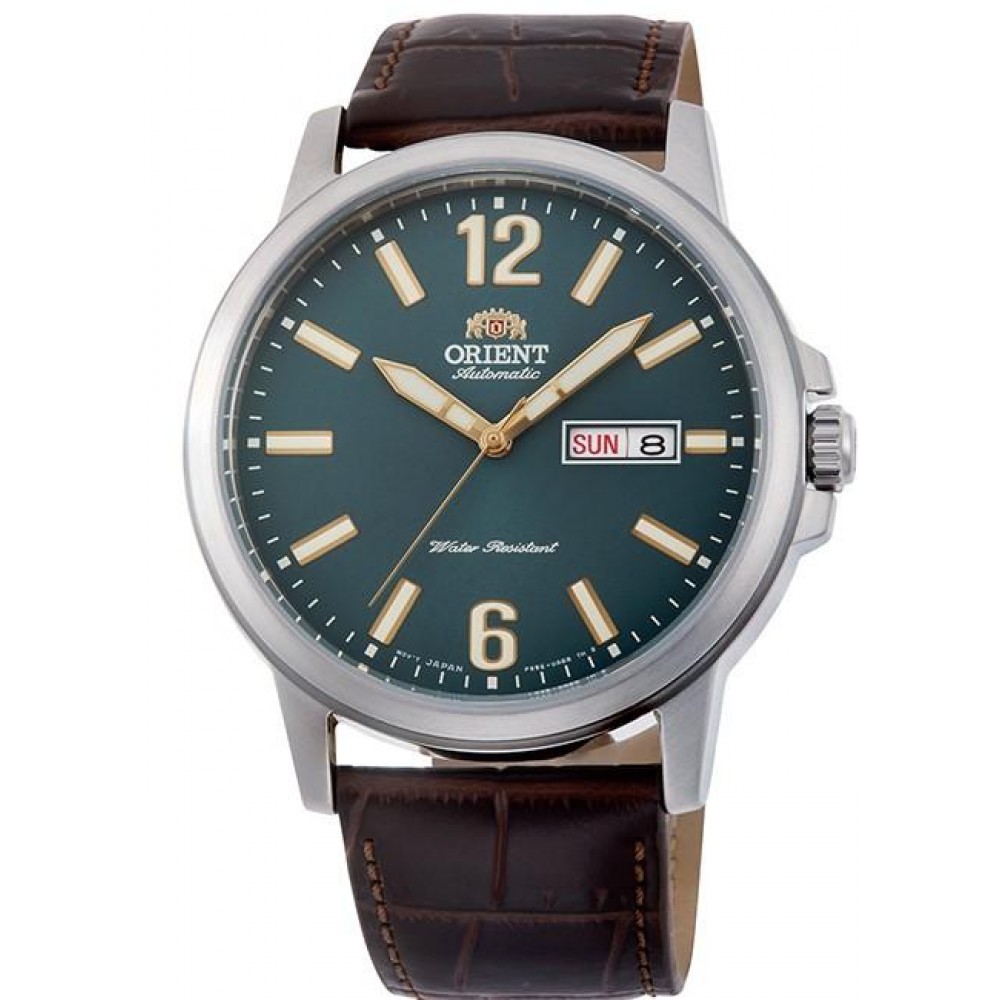 Orient Contemporary RN-AA0C06E - men's watch produced by Orient. It is equipped with Japanese automatic movement and F6922 calibre. Stainless steel case of round shape. Case dimensions are 41.9 mm. in diameter. The dial of this Orient watch is green. Display type: analog. This timepiece has mineral glass. Leather band, band color: brown. 50 m. water resistance. The watch is from Orient Contemporary collection. The following features are equipped: glowing hands, glowing markers, date, day.