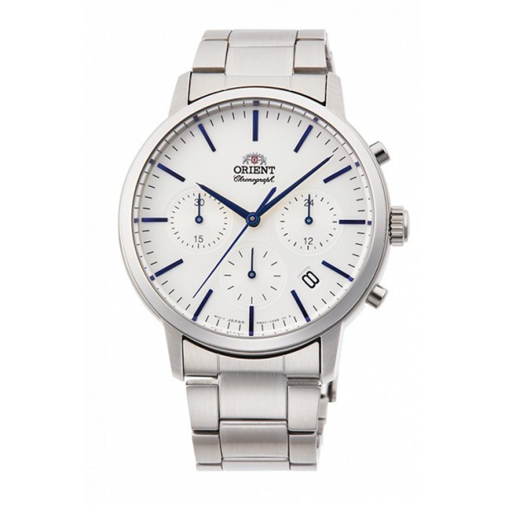 Orient Contemporary RN-KV0302S - men's watch produced by Orient. It is equipped with Japanese quartz movement and RMD00 calibre. Stainless steel case of round shape. Case dimensions are 40.4 mm. in diameter and 9.9 mm. in thickness. The dial of this Orient watch is white. Display type: analog. This timepiece has mineral glass. Stainless steel band, band color: silver. 50 m. water resistance. The watch is from Orient Contemporary collection. The following features are equipped: antimagnetic, date, chronograph.