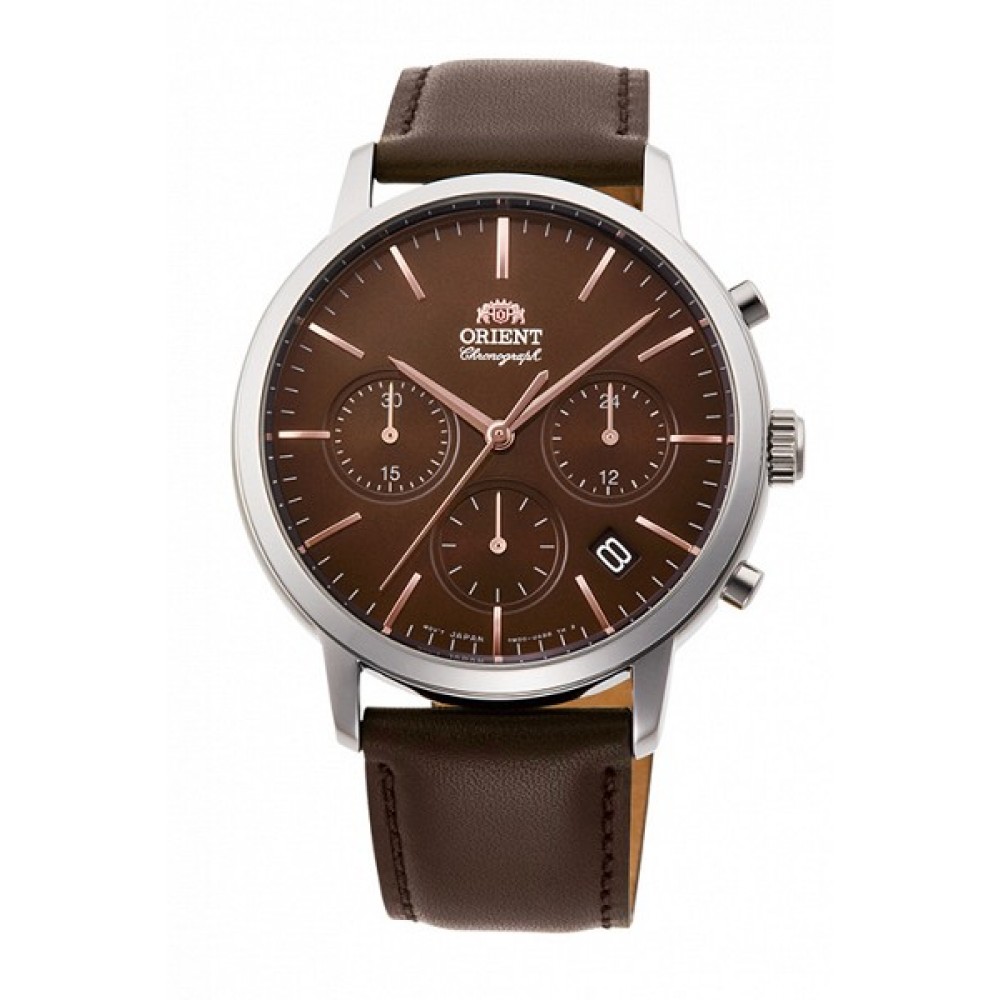 Orient Contemporary RN-KV0304Y - men's watch manufactured by Orient. It is equipped with Japanese quartz movement and RMD00 calibre. Stainless steel case of round shape. Case dimensions are 40.4 mm. in diameter and 9.9 mm. in thickness. The dial of this Orient watch is brown. Display type: analog. This timepiece has mineral glass. Leather band, band color: brown. 50 m. water resistance. The watch is from Orient Contemporary collection. The following features are equipped: antimagnetic, date, chronograph.