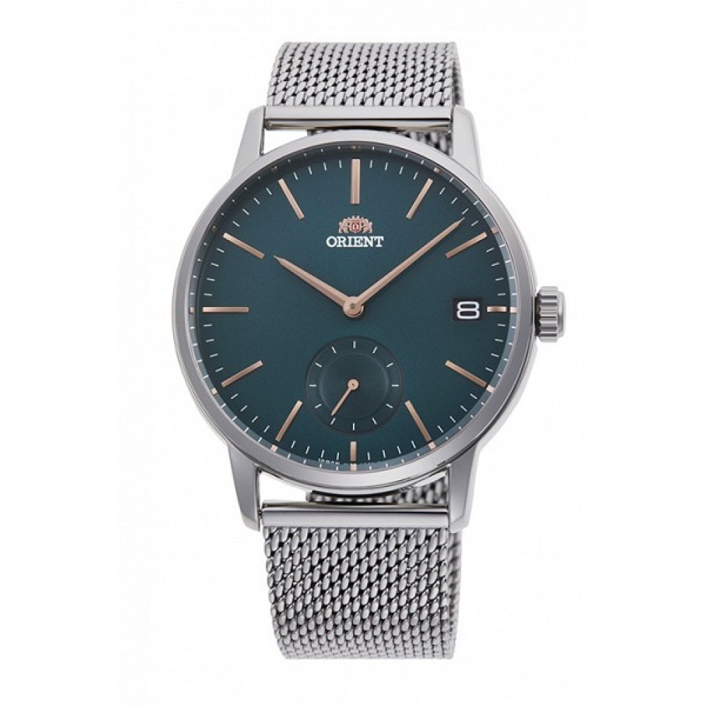 Orient Contemporary RN-SP0006E - men's watch manufactured by Orient. It is equipped with Japanese quartz movement and VL582 calibre. Stainless steel case of round shape. Case dimensions are 39 mm. in diameter and 9.4 mm. in thickness. The dial of this Orient watch is green. Display type: analog. This timepiece has mineral glass. Stainless steel band, band color: silver. 50 m. water resistance. The watch is from Orient Contemporary collection. The following features are equipped: date.