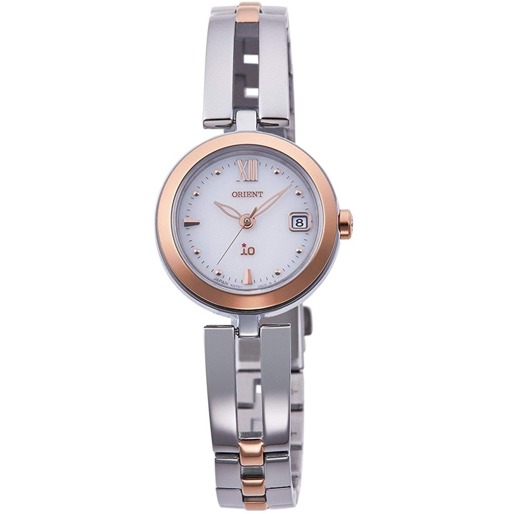 Orient iO Natural & Plain RN-WG0002S - ladies watch produced by Orient. It has Japanese solar quartz movement and V137F calibre. Stainless steel, gold plated case of round shape. Case dimensions are 24 mm. in diameter and 6.9 mm. in thickness. The dial of this Orient watch is white. Display type: analog. This timepiece has sapphire glass. Stainless steel, gold plated band, band color: silver, gold. 50 m. water resistance. The watch is from IO collection. The following features are equipped: date.