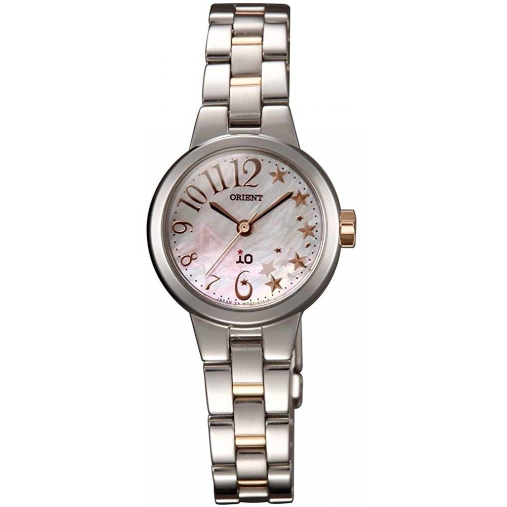 Orient iO Shooting Star WI0271WD - ladies watch produced by Orient. It is equipped with Japanese solar quartz movement and KK500 calibre. Stainless steel case of round shape. Case dimensions are 24.5 mm. in diameter and 7.4 mm. in thickness. The dial of this Orient watch is pink, mother of pearl. Display type: analog. This timepiece has mineral glass. Stainless steel, gold plated band, band color: silver, gold. 30 m. water resistance. The watch is from IO collection.