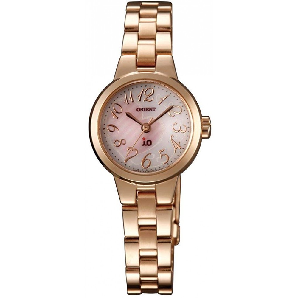 Orient iO Sweet & Spicy WI0261WD - ladies watch manufactured by Orient. It has Japanese solar quartz movement and KK500 calibre. Stainless steel, gold plated case of round shape. Case dimensions are 24.5 mm. in diameter and 7.4 mm. in thickness. The dial of this Orient watch is pink, mother of pearl. Display type: analog. This timepiece has mineral glass. Stainless steel, gold plated band, band color: gold. 30 m. water resistance. The watch is from IO collection.