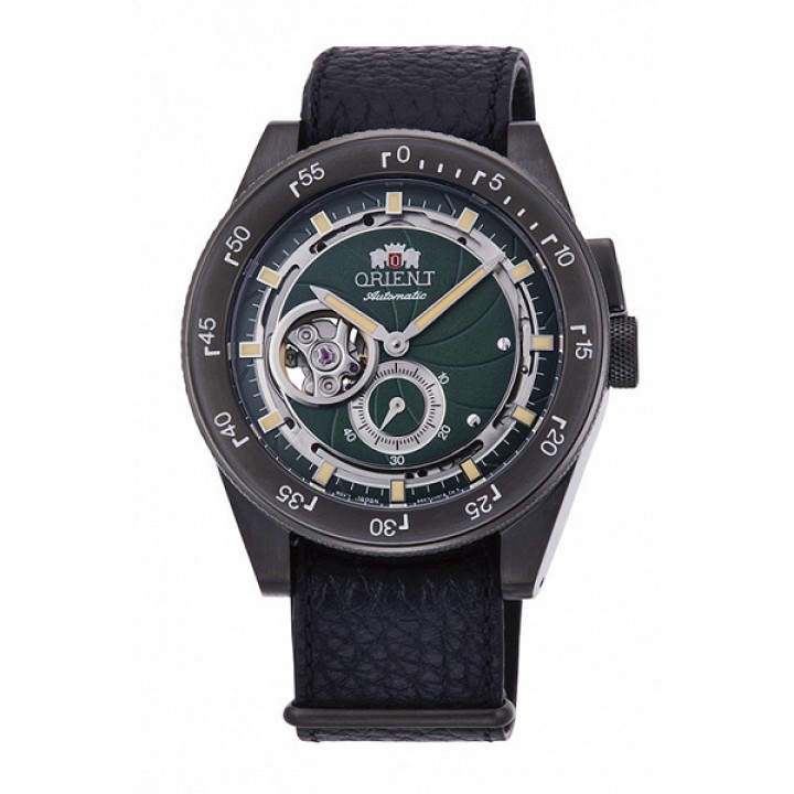 Orient Revival Retro Future Camera RN-AR0202E - men's watch made by Orient. It has Japanese automatic movement and F6S22 calibre. Stainless steel, hard coating case of round shape. Case dimensions are 40.8 mm. in diameter and 12.6 mm. in thickness. The dial of this Orient watch is green. Display type: analog. This timepiece has mineral glass. Leather band, band color: black. 50 m. water resistance. The watch is from Revival collection. The following features are equipped: glowing hands, glowing markers, antimagnetic.