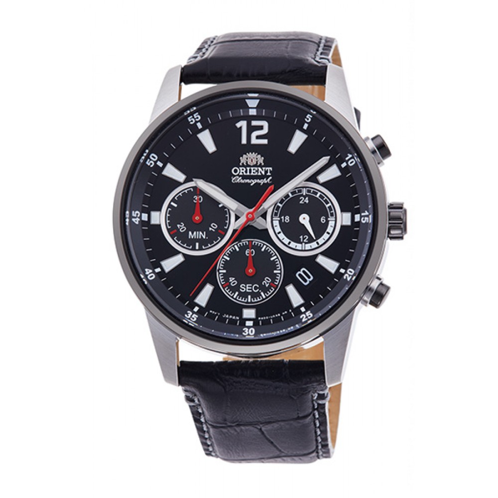 ORIENT RN-KV0004B - men's watch produced by Orient. It is equipped with Japanese quartz movement and RMD00 calibre. Stainless steel case of round shape. Case dimensions are 42 mm. in diameter and 10.3 mm. in thickness. The dial of this Orient watch is black. Display type: analog. This timepiece has mineral glass. Leather band, band color: black. 100 m. water resistance. The watch is from Orient Sports collection. The following features are equipped: date, chronograph, glowing hands, glowing markers.