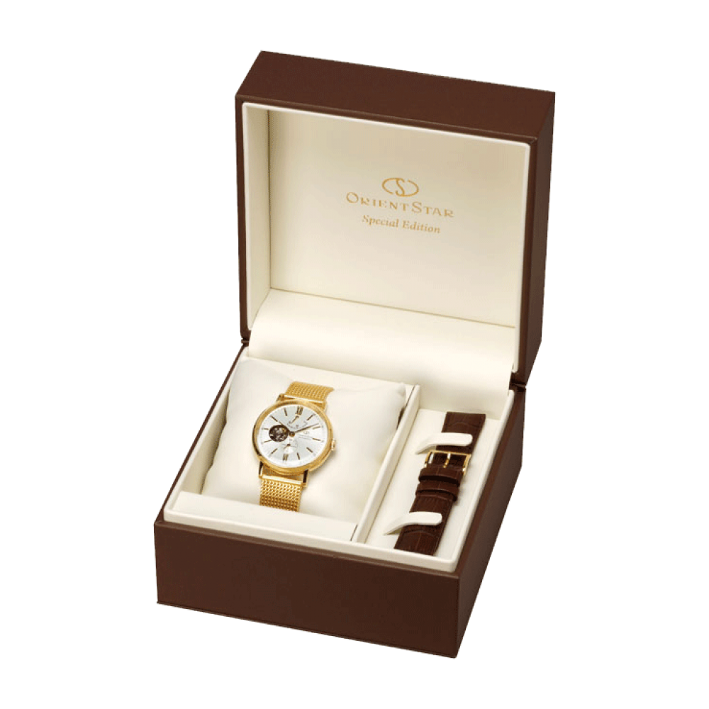 Orient Star Classic Limited Model WZ0171DK - men's watch made by Orient. It is equipped with Japanese automatic movement and 40S63 calibre. Stainless steel, gold plated case of round shape. Case dimensions are 40 mm. in diameter and 13.2 mm. in thickness. The dial of this Orient watch is silver. Display type: analog. This timepiece has mineral glass. Stainless steel, gold plated band, leather band, band color: gold, brown. 50 m. water resistance. The watch is from Orient Classic, Orient Star collections. The following features are equipped: antimagnetic, power reserve indicator, limited edition.