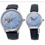 Orient Star Classic Semi Skeleton Pair RK-AT0203L RK-ND0012L - men's, ladies watch made by Orient. It has Japanese automatic movement and F6R42, 55C22 calibre. Stainless steel case of round shape. Case dimensions are 40.4, 30.5 mm. in diameter and 12.8, 11.0 mm. in thickness. The dial of this Orient watch is blue. Display type: analog. This timepiece has mineral glass. Leather band, band color: navy. 50 m. water resistance. The watch is from Orient Classic, Orient Star collections. The following features are equipped: antimagnetic, power reserve indicator.