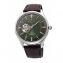 Orient Star Classic Semi Skeleton RK-AT0202E - men's watch manufactured by Orient. It is equipped with Japanese automatic movement and F6R42 calibre. Stainless steel case of round shape. Case dimensions are 40.4 mm. in diameter and 12.8 mm. in thickness. The dial of this Orient watch is green. Display type: analog. This timepiece has mineral glass. Leather band, band color: brown. 50 m. water resistance. The watch is from Orient Star collection. The following features are equipped: power reserve indicator, antimagnetic.