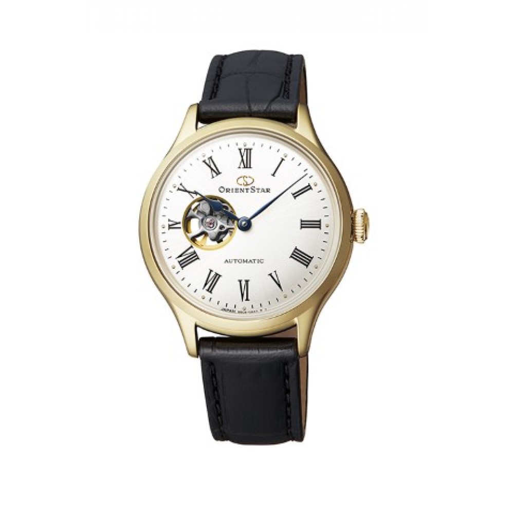 Orient Star Classic Semi Skeleton RK-ND0004S - ladies watch made by Orient. It has Japanese automatic movement and 55C40 calibre. Stainless steel, gold plated case of round shape. Case dimensions are 30.5 mm. in diameter and 11 mm. in thickness. The dial of this Orient watch is silver, white. Display type: analog. This timepiece has mineral glass. Leather band, band color: black. 50 m. water resistance. The watch is from Orient Classic collection. The following features are equipped: antimagnetic.