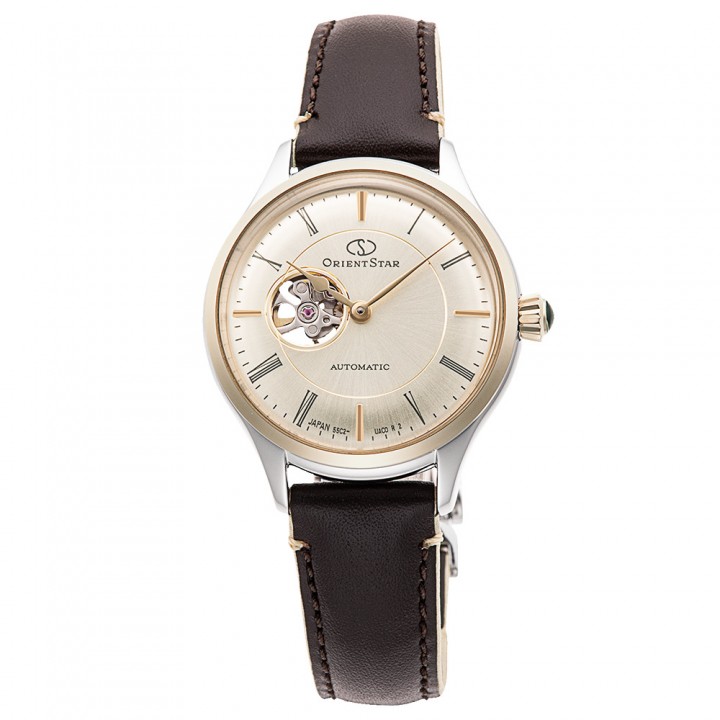 Orient Star Classic Semi Skeleton RK-ND0010G - ladies watch produced by Orient. It is equipped with Japanese automatic movement and 55C22 calibre. Stainless steel, gold plated case of round shape. Case dimensions are 30.5 mm. in diameter and 11 mm. in thickness. The dial of this Orient watch is gold. Display type: analog. This timepiece has mineral glass. Leather band, band color: brown. 50 m. water resistance. The watch is from Orient Star collection. The following features are equipped: antimagnetic.