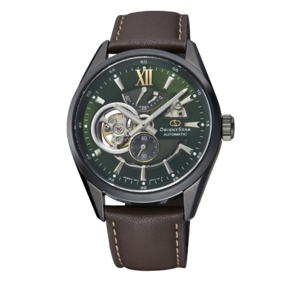 Orient Star Contemporary Modern Skeleton Limited Model RK-AV0010E - men's watch manufactured by Orient. It is equipped with Japanese automatic movement and F6F44 calibre. Stainless steel, hard coating case of round shape. Case dimensions are 41 mm. in diameter and 12 mm. in thickness. The dial of this Orient watch is green. Display type: analog. This timepiece has sapphire, antireflection coating glass. Leather band, band color: brown. 100 m. water resistance. The watch is from Orient Contemporary collection. The following features are equipped: antimagnetic, power reserve indicator, glowing hands, glowing markers, limited edition.