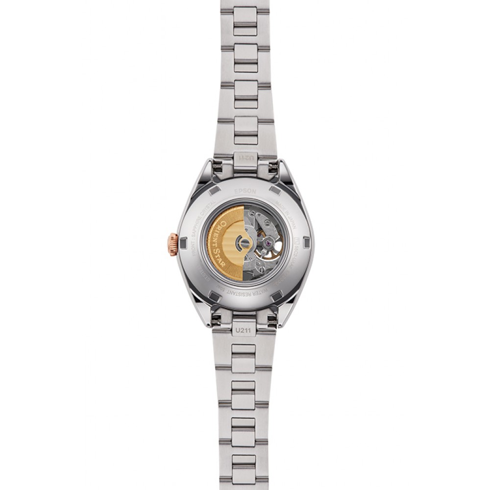 Orient Star Contemporary Semi Skeleton RK-ND0101S - ladies watch manufactured by Orient. It has Japanese automatic movement and 55C22 calibre. Stainless steel, gold plated case of round shape. Case dimensions are 30 mm. in diameter and 10.2 mm. in thickness. The dial of this Orient watch is silver. Display type: analog. This timepiece has sapphire, antireflection coating glass. Stainless steel band, band color: silver. 50 m. water resistance. The watch is from Orient Star collection. The following features are equipped: antimagnetic, diamond set.