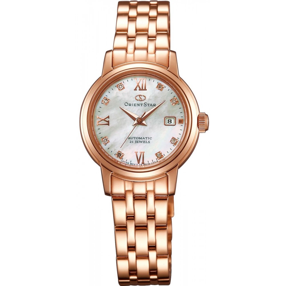 Orient Star Contemporary Standard WZ0451NR - ladies watch produced by Orient. It is equipped with Japanese automatic movement and 5574D calibre. Stainless steel, gold plated case of round shape. Case dimensions are 27.5 mm. in diameter and 10.9 mm. in thickness. The dial of this Orient watch is mother of pearl. Display type: analog. This timepiece has sapphire, antireflection coating glass. Stainless steel, gold plated band, band color: gold. 50 m. water resistance. The watch is from Orient Star collection. The following features are equipped: antimagnetic, date, diamond set.