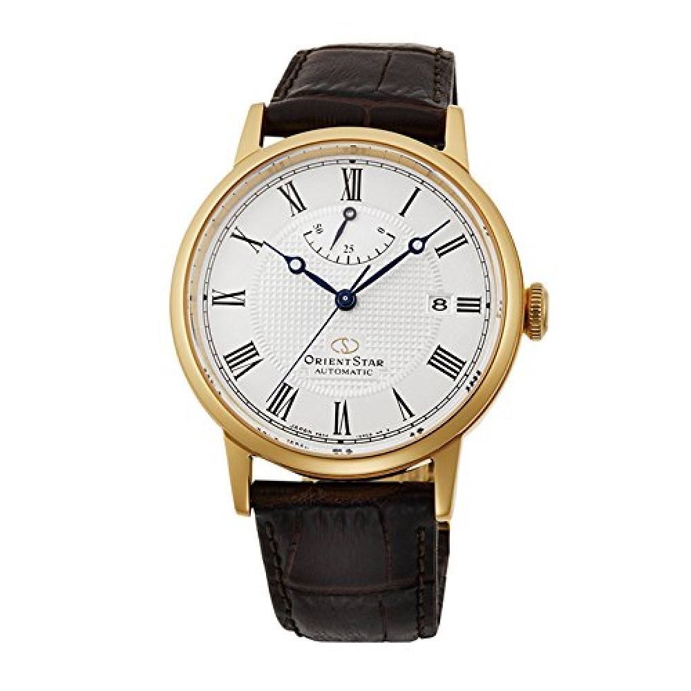 ORIENT STAR RK-AU0001S - men's watch produced by Orient. It is equipped with Japanese automatic movement and F6N43 calibre. Stainless steel, gold plated case of round shape. Case dimensions are 38.7 mm. in diameter and 12.8 mm. in thickness. The dial of this Orient watch is white. Display type: analog. This timepiece has sapphire, antireflection coating glass. Leather band, band color: brown. 50 m. water resistance. The watch is from Orient Star collection. The following features are equipped: antimagnetic, date, power reserve indicator.