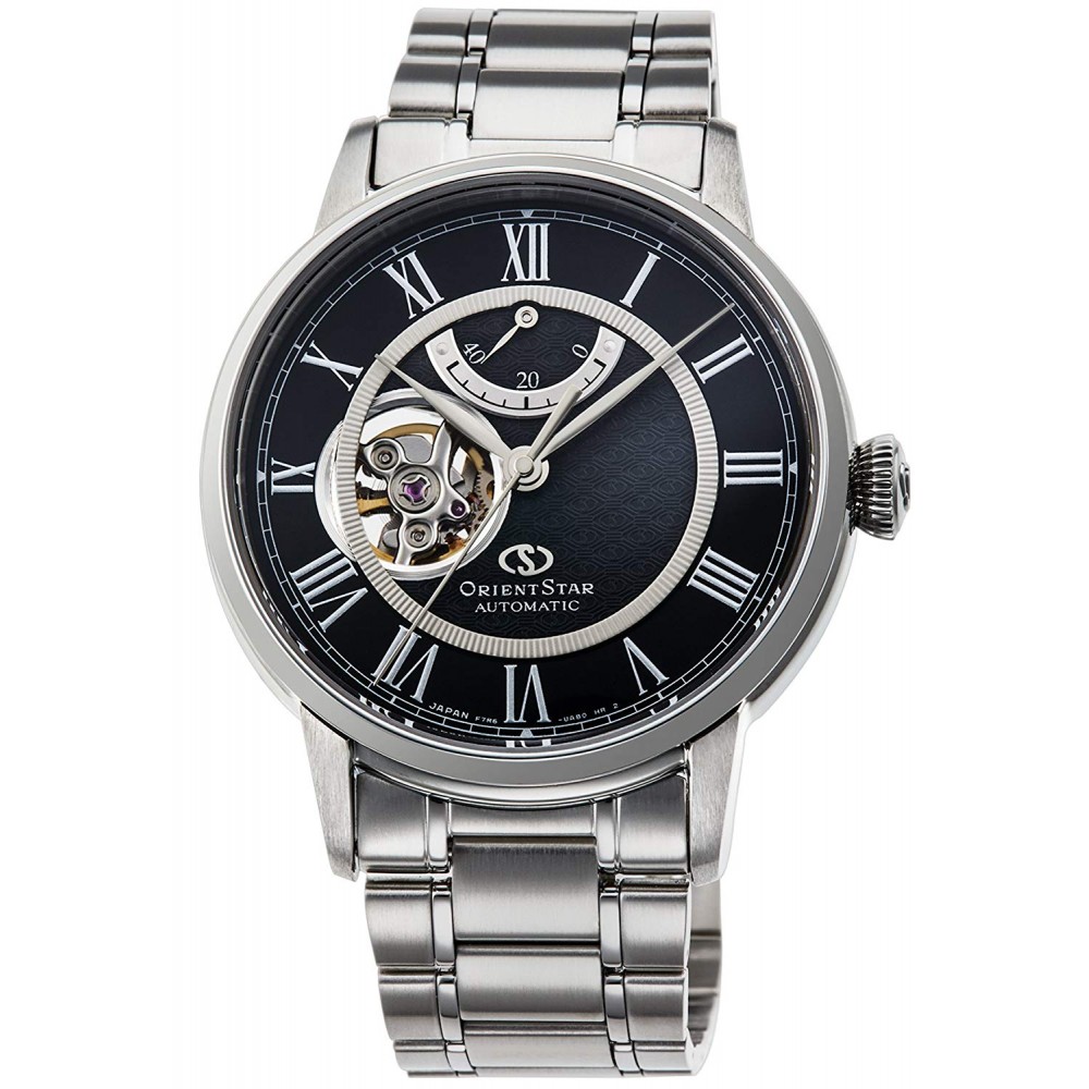 ORIENT STAR RK-HH0004B - men's watch produced by Orient. It is equipped with Japanese automatic movement and Series 46 F7 calibre. Stainless steel case of round shape. Case dimensions are 40 mm. in diameter and 12.3 mm. in thickness. The dial of this Orient watch is black. Display type: analog. This timepiece has sapphire, antireflection coating glass. Stainless steel band, band color: silver. 50 m. water resistance. The watch is from Orient Star collection. The following features are equipped: antimagnetic, power reserve indicator.