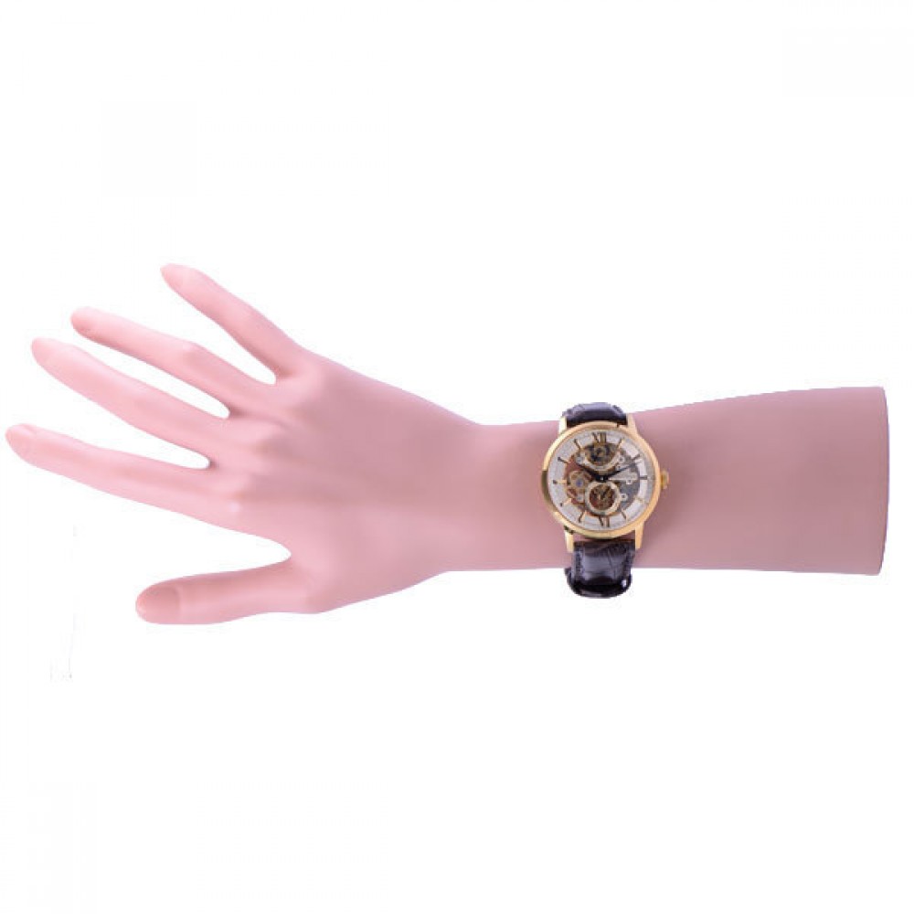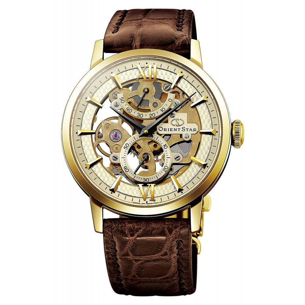 ORIENT STAR WZ0031DX - men's watch made by Orient. It is equipped with Japanese hand wind movement and 48 E 51 calibre. Stainless steel case of round shape. Case dimensions are 39 mm. in diameter and 10.6 mm. in thickness. The dial of this Orient watch is gold. Display type: analog. This timepiece has sapphire glass. Crocodile leather band, band color: brown. 50 m. water resistance. The watch is from Orient Star collection. The following features are equipped: antimagnetic, power reserve indicator.