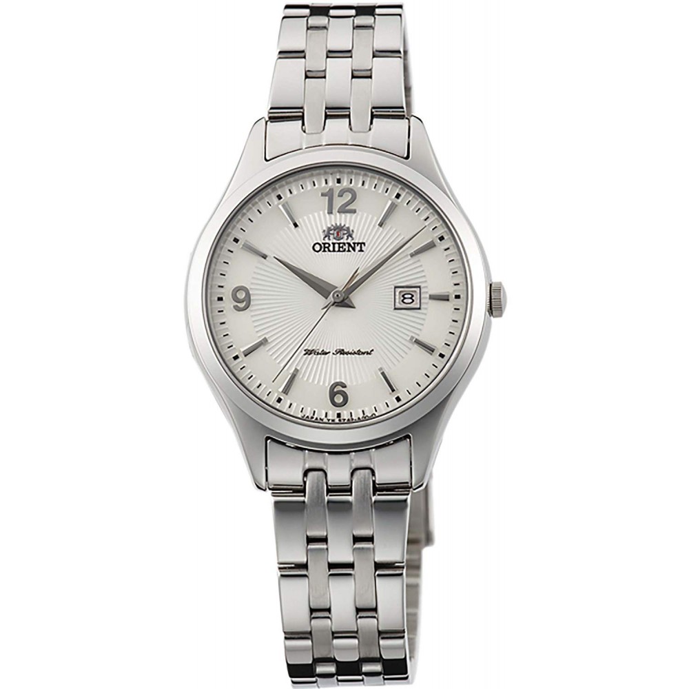 ORIENT WORLD STAGE WV0171SZ - ladies watch made by Orient. It is equipped with Japanese quartz movement and HE721 calibre. Stainless steel case of round shape. Case dimensions are 30 mm. in diameter and 6.4 mm. in thickness. The dial of this Orient watch is white, silver. Display type: analog. This timepiece has sapphire glass. Stainless steel band, band color: silver. 30 m. water resistance. The watch is from World Stage collection. The following features are equipped: date.