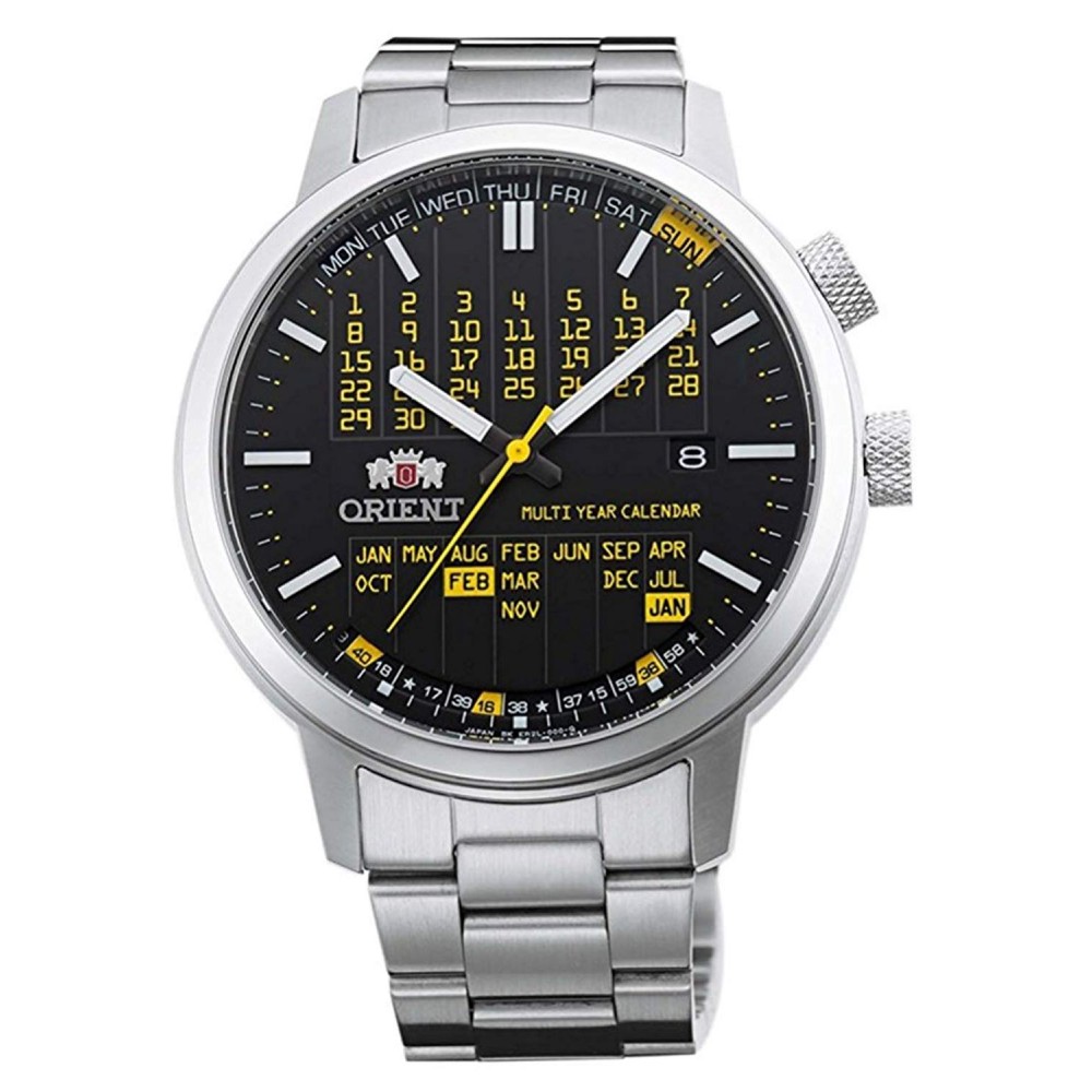 ORIENT WV0871ER - men's watch produced by Orient. It is equipped with Japanese automatic movement and 48743 calibre. Stainless steel case of round shape. Case dimensions are 42 mm. in diameter and 11.4 mm. in thickness. The dial of this Orient watch is black. Display type: analog. This timepiece has mineral glass. Stainless steel band, band color: silver. 50 m. water resistance. The watch is from Orient Stylish and Smart collection. The following features are equipped: date, annual calendar, antimagnetic.