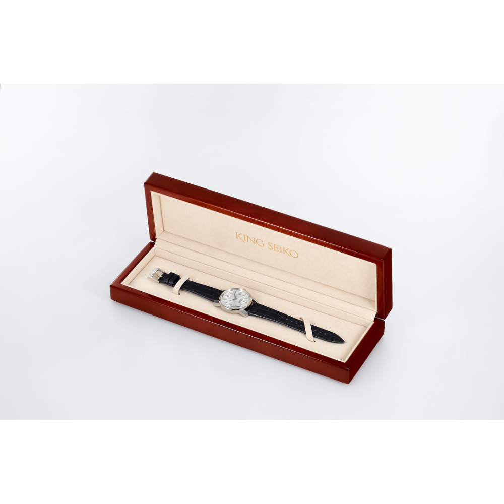 Seiko 140th Anniversary Limited Model King Seiko "KSK" Reprint Design SDKA001 - men's watch produced by Seiko. It has Japanese automatic movement and 6L35 calibre. Stainless steel, hard coating case of round shape. Case dimensions are 38.1 mm. in diameter and 11.4 mm. in thickness. The dial of this Seiko watch is silver. Display type: analog. This timepiece has sapphire, antireflection coating glass. Crocodile band, band color: black. 50 m. water resistance. The watch is from King Seiko collection. The following features are equipped: antimagnetic, date, limited edition.