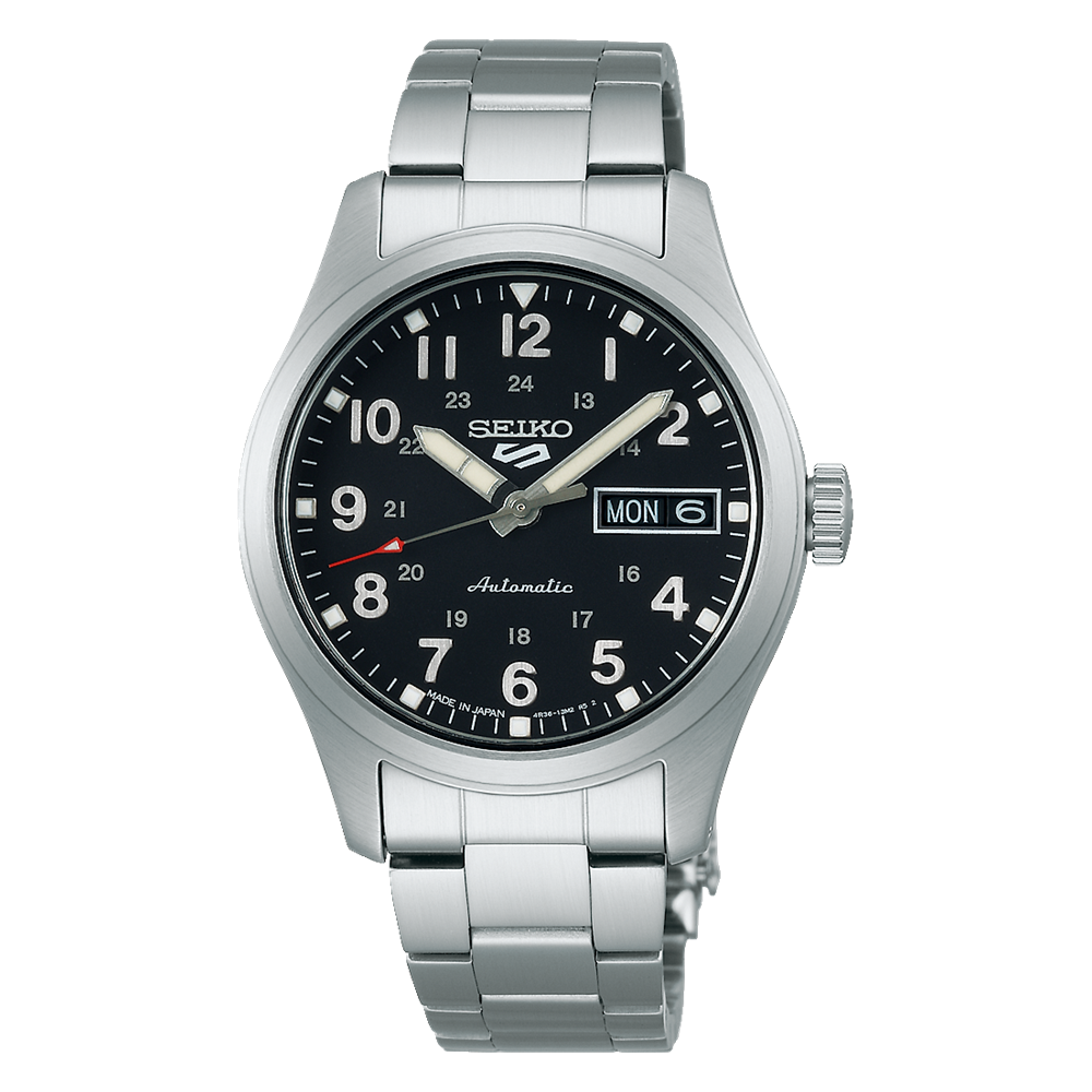 Seiko 5 Sports Limited Model SBSA197 - men's watch produced by Seiko. It is equipped with Japanese automatic movement and 4R36 calibre. Stainless steel case of round shape. Case dimensions are 36.4 mm. in diameter and 12.5 mm. in thickness. The dial of this Seiko watch is black. Display type: analog. This timepiece has hardlex glass. Stainless steel band, band color: silver. 100 m. water resistance. The watch is from 5 Sports collection. The following features are equipped: date, day, glowing hands, glowing markers, antimagnetic.