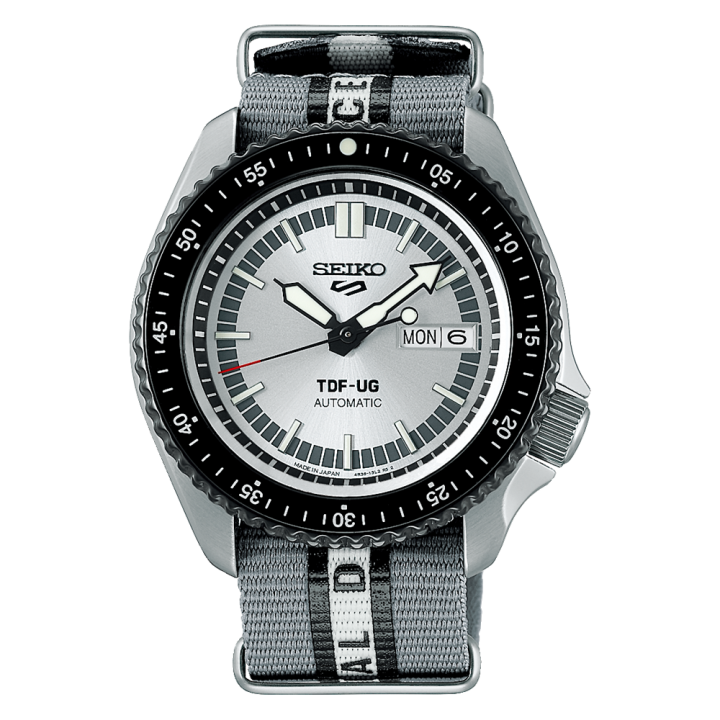 Seiko 5 Sports SKX Sense Style 55th Anniversary Ultra Seven Collaboration Limited Edition SBSA195 - men's watch manufactured by Seiko. It has Japanese automatic movement and 4R36 calibre. Stainless steel case of round shape. Case dimensions are 42.5 mm. in diameter and 13.4 mm. in thickness. The dial of this Seiko watch is silver. Display type: analog. This timepiece has hardlex glass. Nylon band, band color: gray. 100 m. water resistance. The watch is from 5 Sports collection. The following features are equipped: date, day, antimagnetic, limited edition, glowing hands, glowing markers.