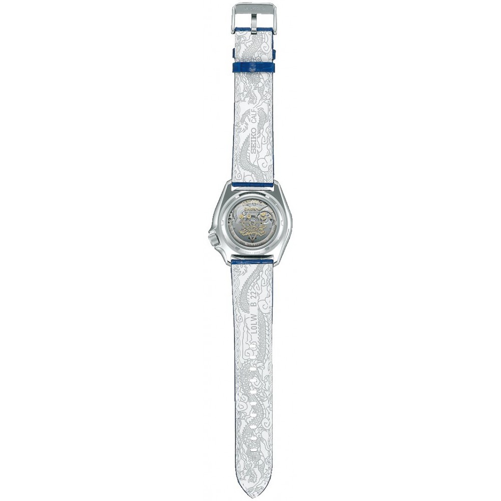 Seiko 5 Sports Street Fighter V Collaboration Chun-Li Limited Model SBSA077 - men's watch made by Seiko. It has Japanese automatic movement and 4R36 calibre. Stainless steel case of round shape. Case dimensions are 42.5 mm. in diameter and 13.4 mm. in thickness. The dial of this Seiko watch is blue. Display type: analog. This timepiece has hardlex glass. Leather band, band color: blue. 100 m. water resistance. The watch is from 5 Sports collection. The following features are equipped: date, day, glowing hands, glowing markers, limited edition, antimagnetic.