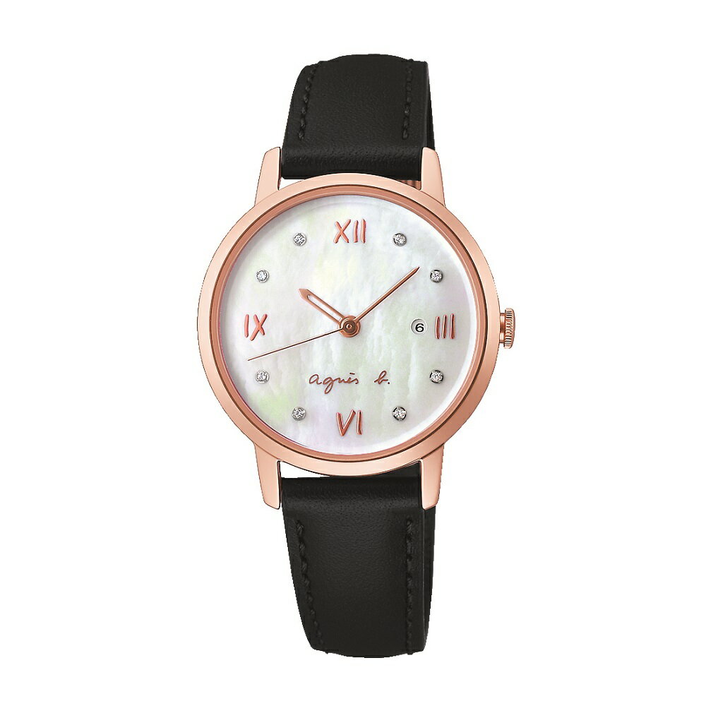 Seiko agnes b. FCSK913 - ladies watch made by Seiko. It is equipped with Japanese quartz movement and VJ22 calibre. Stainless steel, gold plated case of round shape. Case dimensions are 30 mm. in diameter and 8 mm. in thickness. The dial of this Seiko watch is mother of pearl. Display type: analog. This timepiece has hardlex glass. Leather band, band color: black. 50 m. water resistance. The watch is from agnes b. collection. The following features are equipped: date, crystal set.