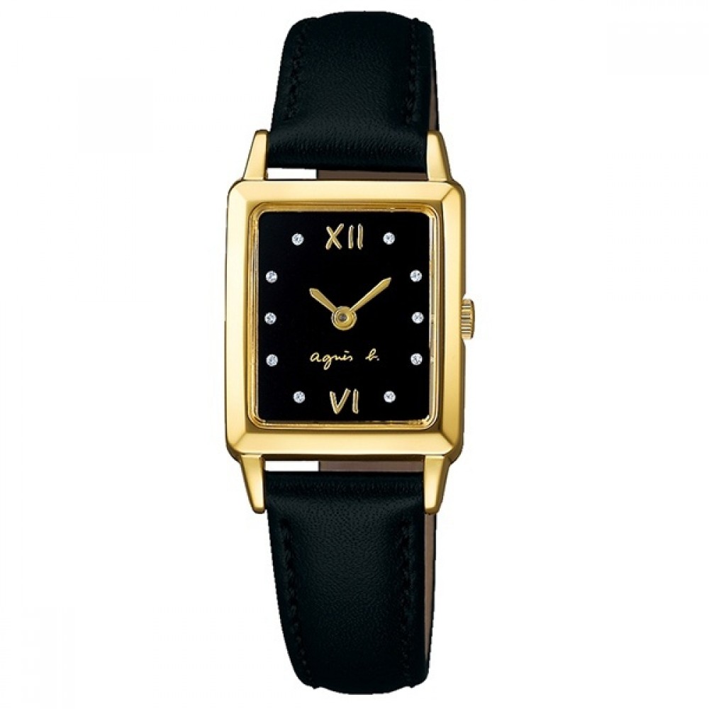 Seiko agnes.b Marcello Christmas Limited Model FCSK721 - ladies watch made by Seiko. It is equipped with Japanese quartz movement and VC00 calibre. Stainless steel, gold plated case of rectangle shape. Case dimensions are 21.1 mm. in diameter and 6.4 mm. in thickness. The dial of this Seiko watch is black. Display type: analog. This timepiece has hardlex glass. Leather band, band color: black. 50 m. water resistance. The watch is from agnes b. collection. The following features are equipped: crystal set, limited edition.