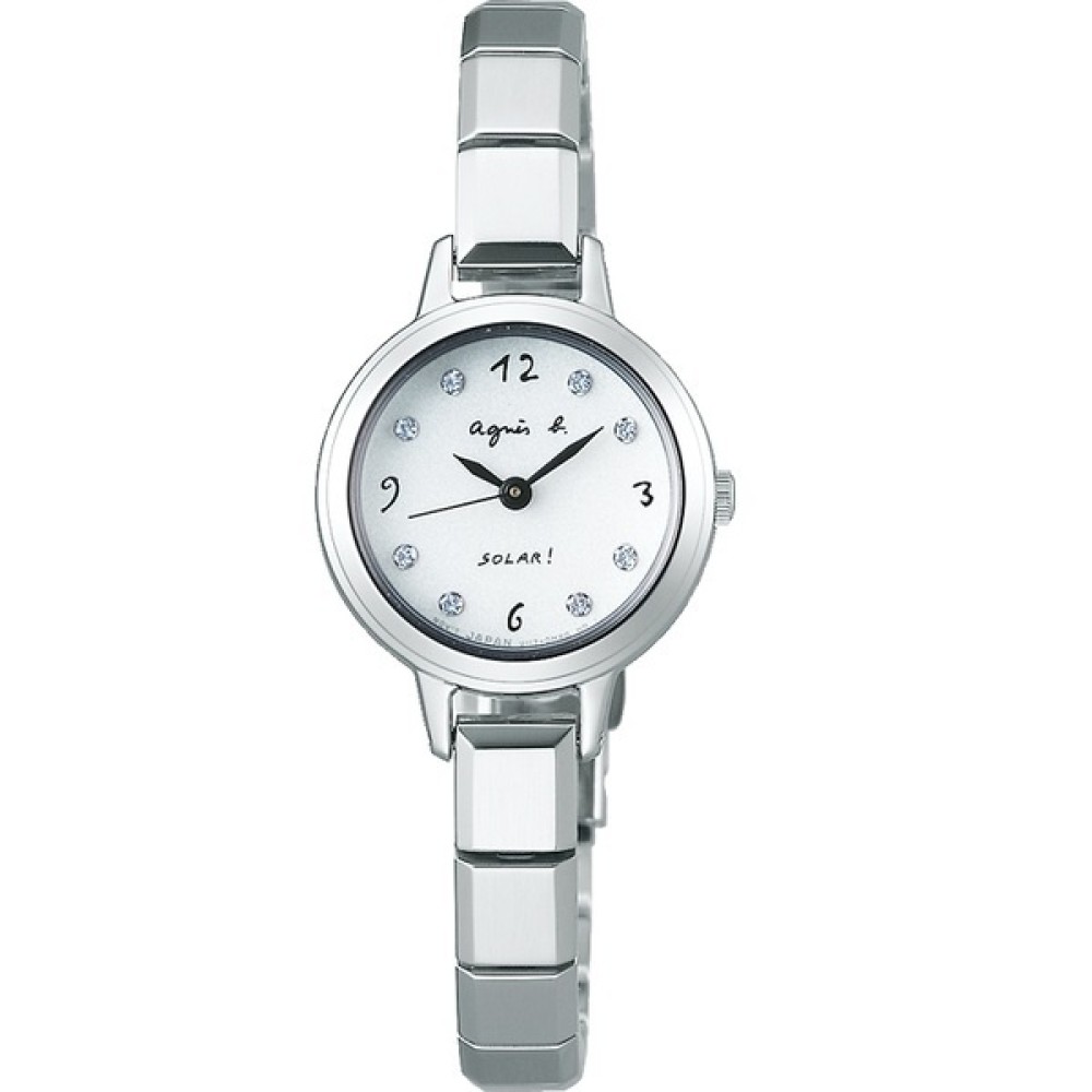 Seiko agnes.b Marcello! FBSD951 - ladies watch produced by Seiko. It is equipped with Japanese solar quartz movement and V117 calibre. Stainless steel case of round shape. Case dimensions are 22 mm. in diameter and 7.1 mm. in thickness. The dial of this Seiko watch is white. Display type: analog. This timepiece has hardlex glass. Stainless steel band, band color: silver. 50 m. water resistance. The watch is from agnes b. collection. The following features are equipped: crystal set.
