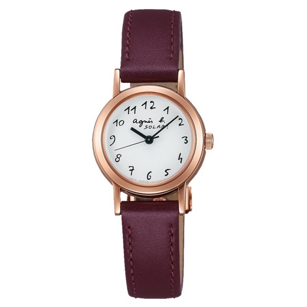 Seiko agnes.b Marcello! FBSD962 - ladies watch manufactured by Seiko. It has Japanese solar quartz movement and V117 calibre. Stainless steel, gold plated case of round shape. Case dimensions are 23.9 mm. in diameter and 7.1 mm. in thickness. The dial of this Seiko watch is white. Display type: analog. This timepiece has hardlex glass. Leather band, band color: burgundy. 100 m. water resistance. The watch is from agnes b. collection.