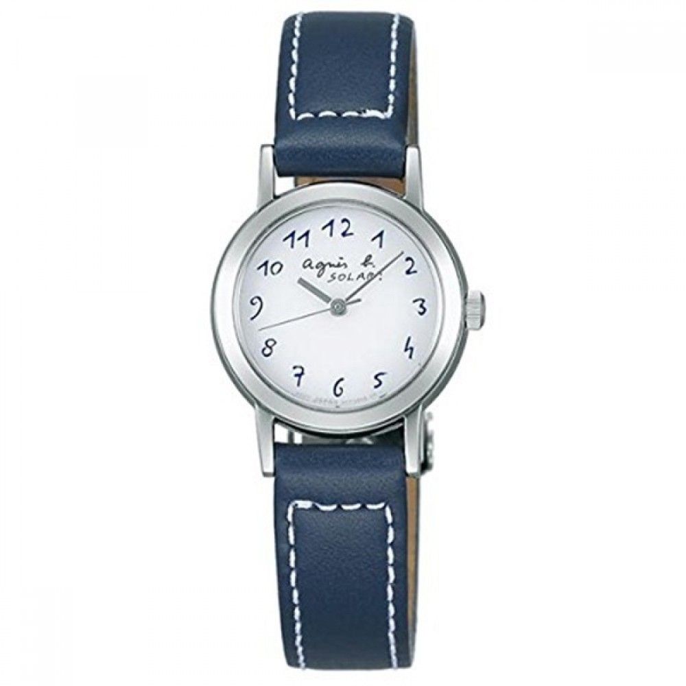 Seiko agnes.b Marcello! FBSD981 - ladies watch produced by Seiko. It is equipped with Japanese solar quartz movement and V117 calibre. Stainless steel case of round shape. Case dimensions are 23.9 mm. in diameter and 7.1 mm. in thickness. The dial of this Seiko watch is white. Display type: analog. This timepiece has hardlex glass. Leather band, band color: blue. 100 m. water resistance. The watch is from agnes b. collection.
