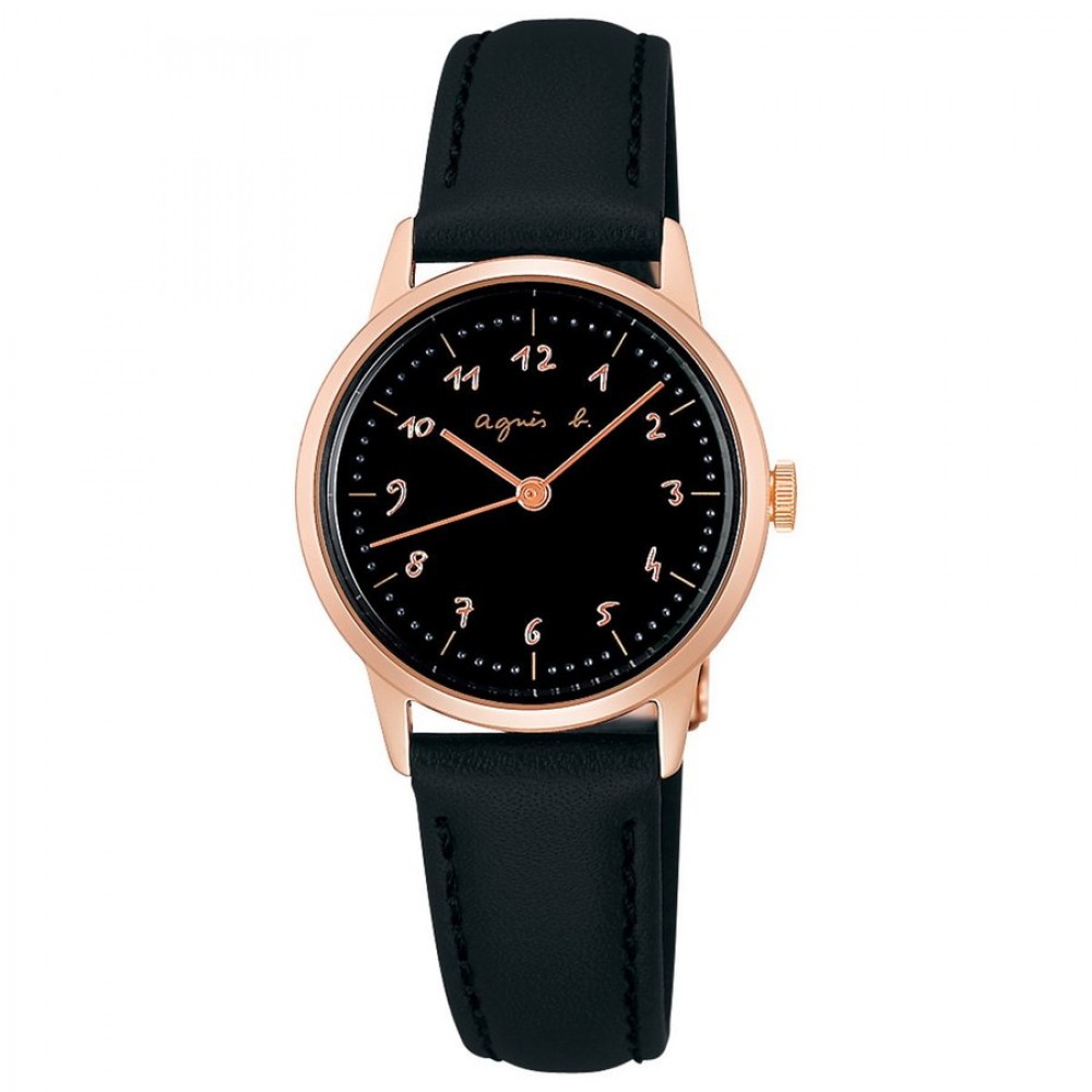 Seiko agnes b. Marcello FBSK939 - ladies watch produced by Seiko. It is equipped with Japanese quartz movement and VJ21 calibre. Stainless steel, gold plated case of round shape. Case dimensions are 27 mm. in diameter and 7.5 mm. in thickness. The dial of this Seiko watch is black. Display type: analog. This timepiece has hardlex glass. Leather band, band color: black. 50 m. water resistance. The watch is from agnes b. collection.