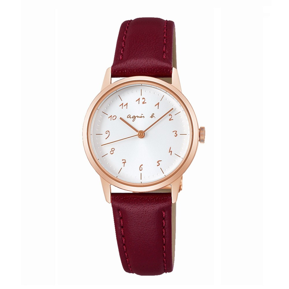 Seiko agnes b. Marcello! FBSK941 - ladies watch made by Seiko. It has Japanese quartz movement and VJ21 calibre. Stainless steel, gold plated case of round shape. Case dimensions are 27 mm. in diameter and 7.5 mm. in thickness. The dial of this Seiko watch is silver. Display type: analog. This timepiece has hardlex glass. Leather band, band color: burgundy. 50 m. water resistance. The watch is from agnes b. collection.