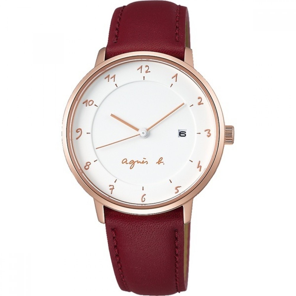 Seiko agnes.b Marcello! FBSK945 - ladies watch manufactured by Seiko. It is equipped with Japanese quartz movement and VJ12 calibre. Stainless steel, gold plated case of round shape. Case dimensions are 33 mm. in diameter and 8.9 mm. in thickness. The dial of this Seiko watch is white. Display type: analog. This timepiece has hardlex glass. Leather band, band color: burgundy. 100 m. water resistance. The watch is from agnes b. collection. The following features are equipped: date.