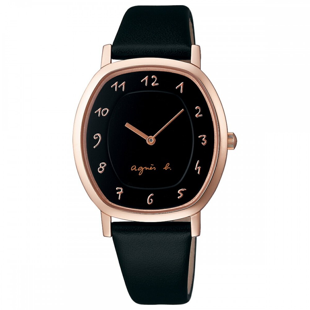 Seiko agnes.b Marcello! FCSK927 - ladies watch made by Seiko. It has Japanese quartz movement and VJ20 calibre. Stainless steel, gold plated case of tonneau shape. Case dimensions are 31 mm. in diameter and 6.8 mm. in thickness. The dial of this Seiko watch is black. Display type: analog. This timepiece has hardlex glass. Leather band, band color: black. 50 m. water resistance. The watch is from agnes b. collection.