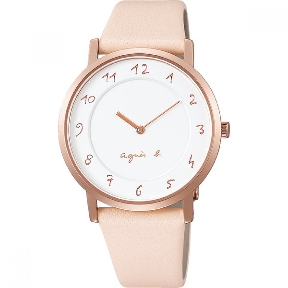 Seiko agnes.b Marcello! FCSK932 - ladies watch manufactured by Seiko. It has Japanese quartz movement and VJ20 calibre. Stainless steel, gold plated case of round shape. Case dimensions are 33.8 mm. in diameter and 6.6 mm. in thickness. The dial of this Seiko watch is white. Display type: analog. This timepiece has hardlex glass. Leather band, band color: pink. 50 m. water resistance. The watch is from agnes b. collection.