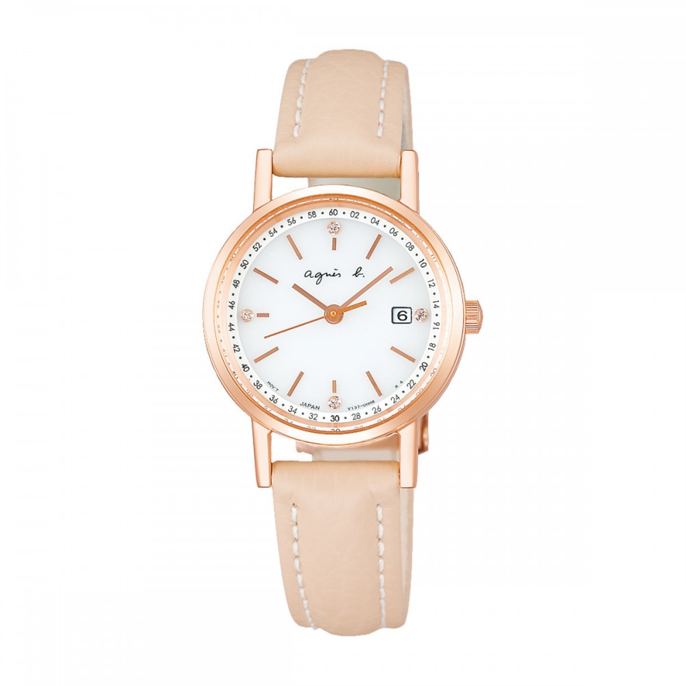 Seiko agnes.b Solar! FBSD937 - ladies watch produced by Seiko. It has Japanese solar quartz movement and V137 calibre. Stainless steel, gold plated case of round shape. Case dimensions are 26.5 mm. in diameter and 7.2 mm. in thickness. The dial of this Seiko watch is white. Display type: analog. This timepiece has hardlex glass. Leather band, band color: beige. 50 m. water resistance. The watch is from agnes b. collection. The following features are equipped: date, crystal set.