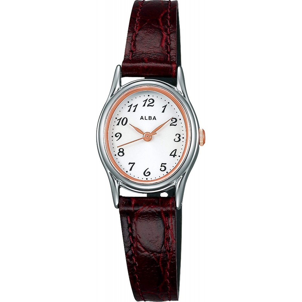 Seiko Alba AIHK003 - ladies watch produced by Seiko. It has Japanese quartz movement and VX01 calibre. Brass, palladium plated case of oval shape. Case dimensions are 20.8 mm. in diameter and 6.3 mm. in thickness. The dial of this Seiko watch is white. Display type: analog. This timepiece has hardlex glass. Leather band, band color: brown. 30 m. water resistance. The watch is from Alba collection.