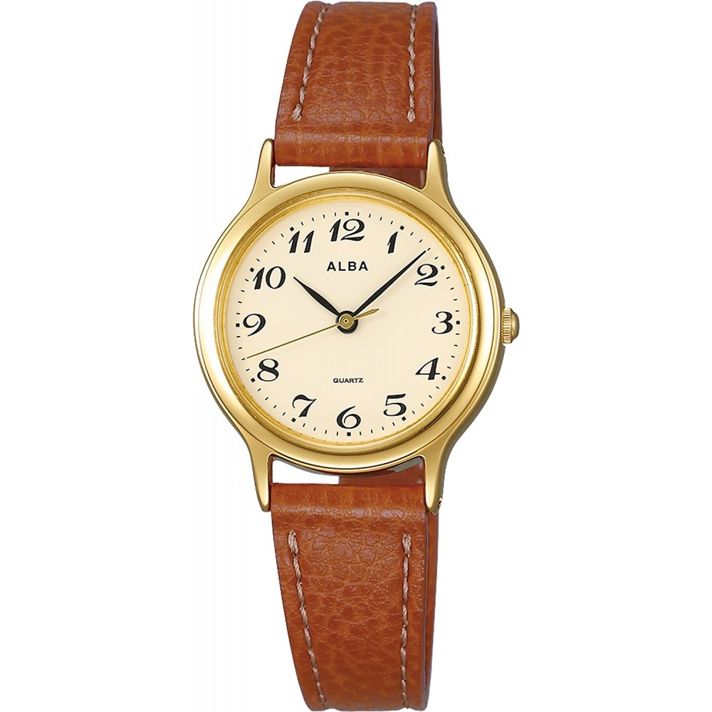 Seiko Alba AIHN002 - ladies watch produced by Seiko. It has Japanese quartz movement and Y121 calibre. Stainless steel, gold plated case of round shape. Case dimensions are 26.6 mm. in diameter and 6.7 mm. in thickness. The dial of this Seiko watch is beige. Display type: analog. This timepiece has hardlex glass. Leather band, band color: brown. 30 m. water resistance. The watch is from Alba collection.
