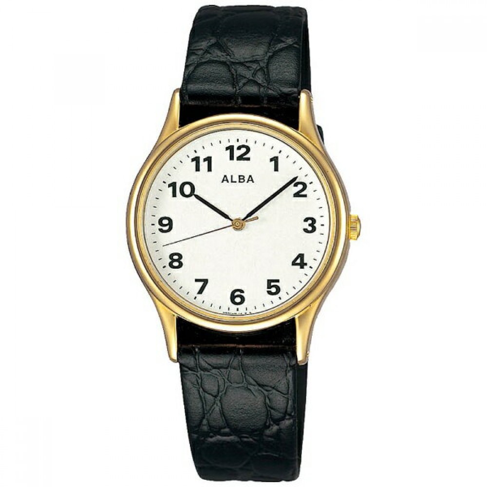 Seiko Alba AQGK420 - ladies watch made by Seiko. It is equipped with Japanese quartz movement and VJ21 calibre. Stainless steel, gold plated case of round shape. Case dimensions are 31 mm. in diameter and 7.4 mm. in thickness. The dial of this Seiko watch is white. Display type: analog. This timepiece has hardlex glass. Leather band, band color: black. 30 m. water resistance. The watch is from Alba collection.
