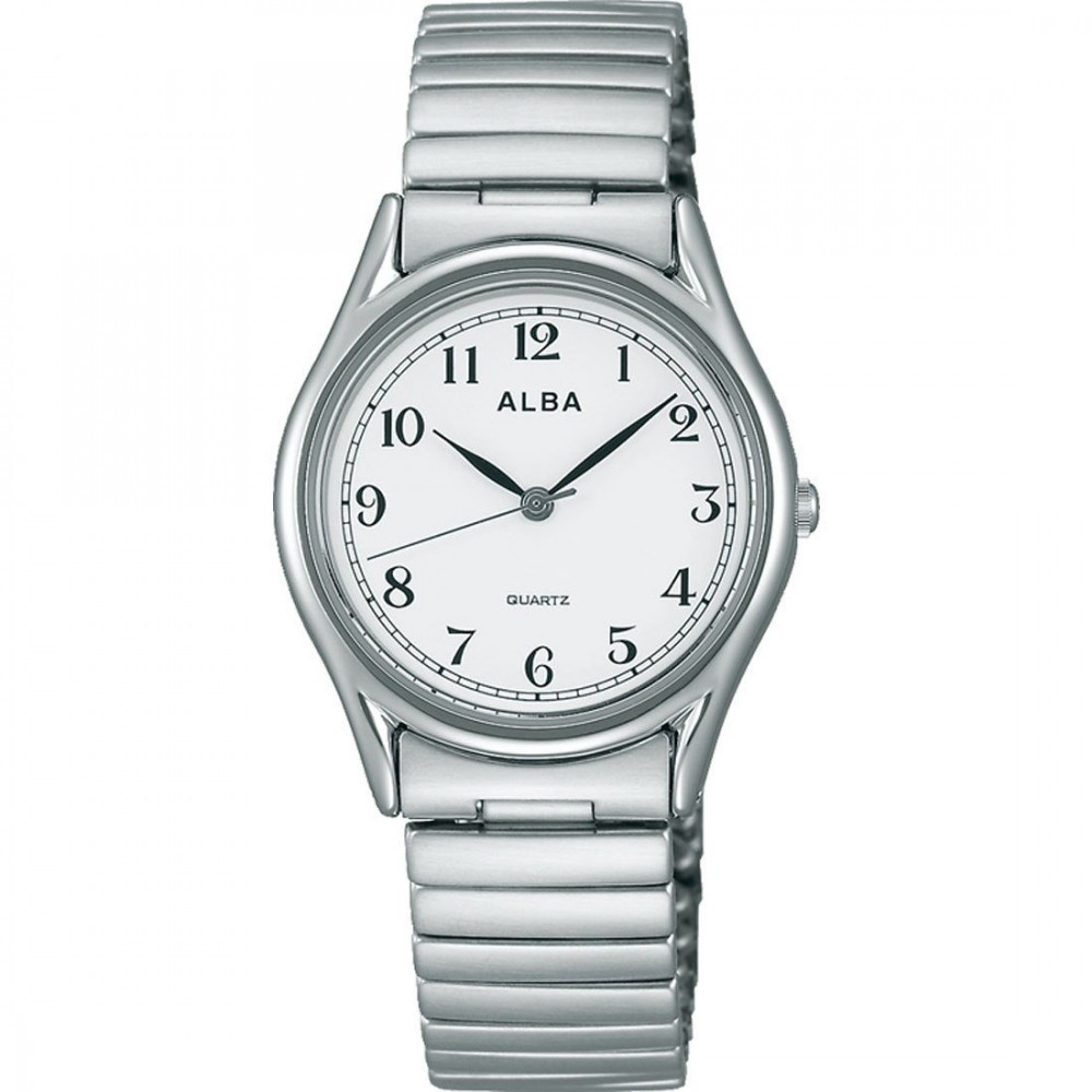 Seiko Alba AQGK439 - unisex watch manufactured by Seiko. It is equipped with Japanese quartz movement and VJ21 calibre. Brass, palladium plated case of round shape. Case dimensions are 31.3 mm. in diameter and 6.3 mm. in thickness. The dial of this Seiko watch is white. Display type: analog. This timepiece has hardlex glass. Stainless steel band, band color: silver. 50 m. water resistance. The watch is from Alba collection.